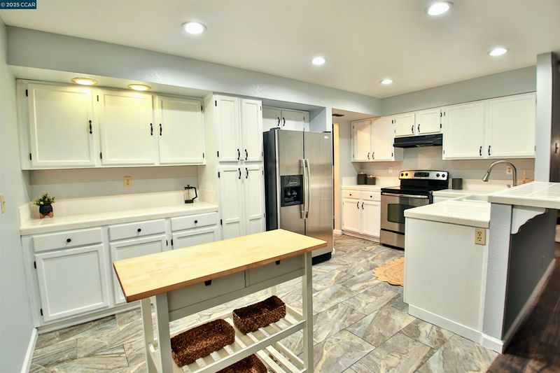 - Dishwasher, Electric Range, Free-Standing Range, Refrigerator, Breakfast Bar, Breakfast Nook, Tile Counters, Electric Range/Cooktop, Disposal, Pantry, Range/Oven Free Standing