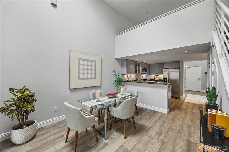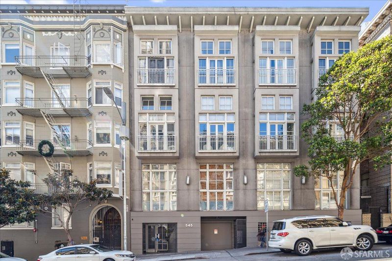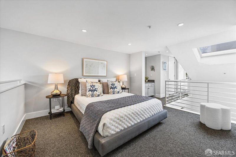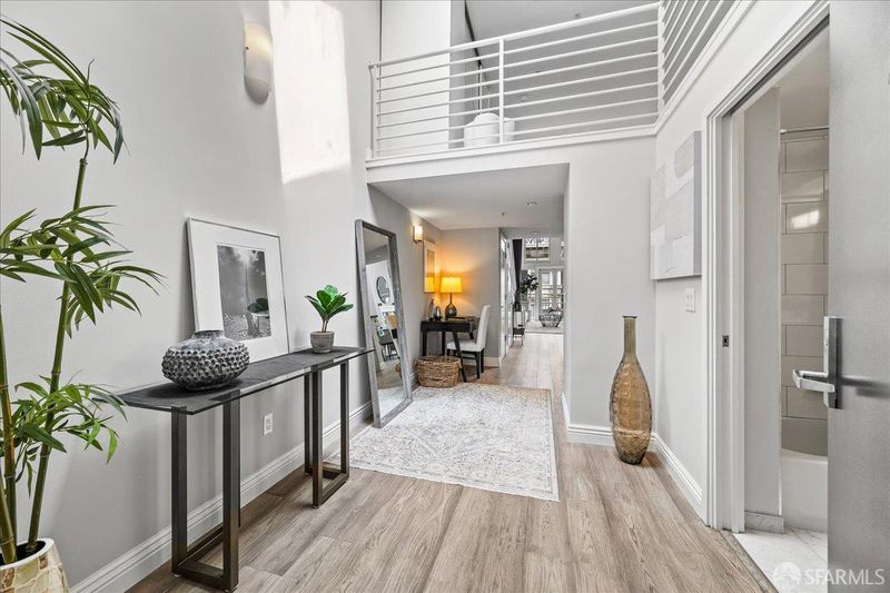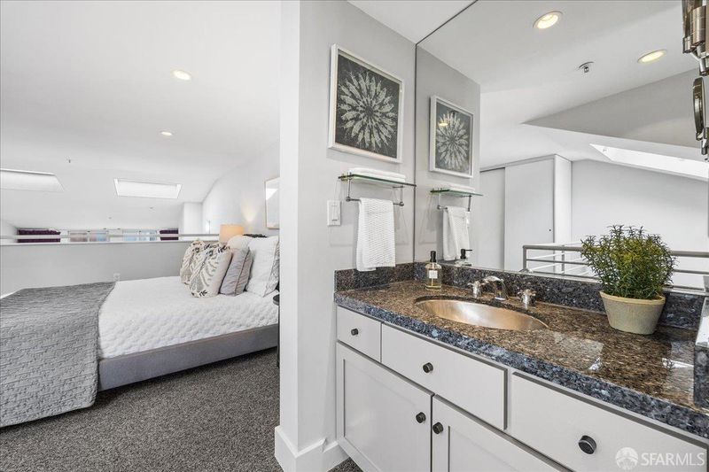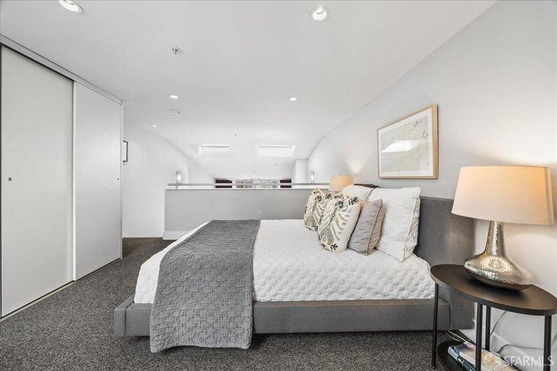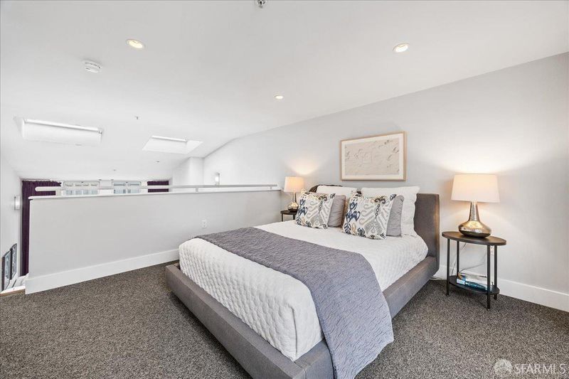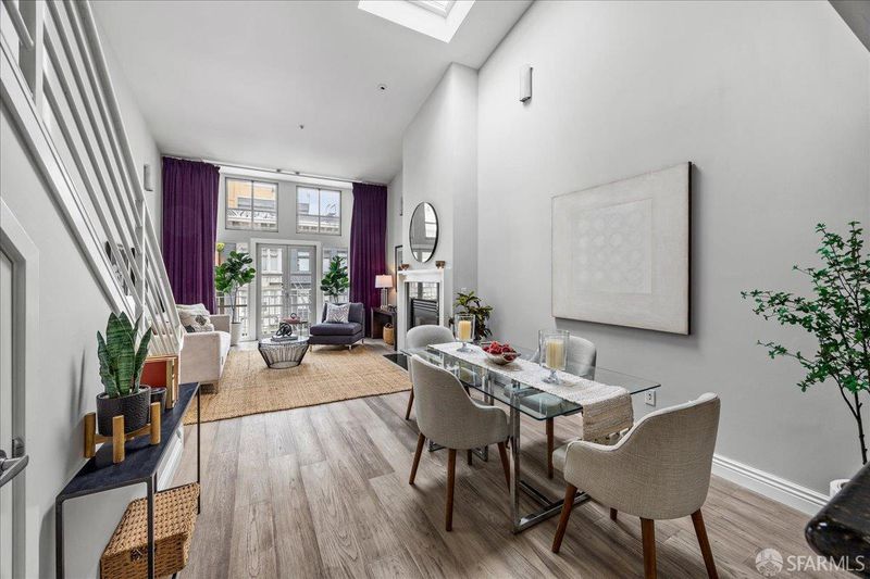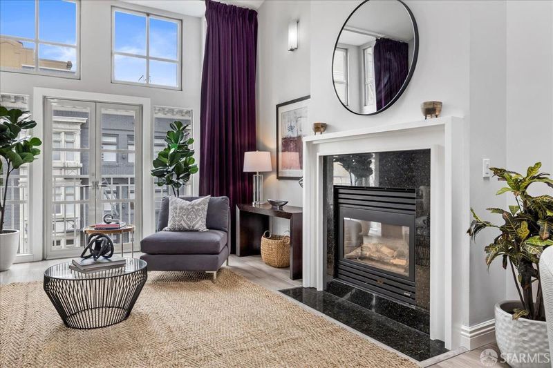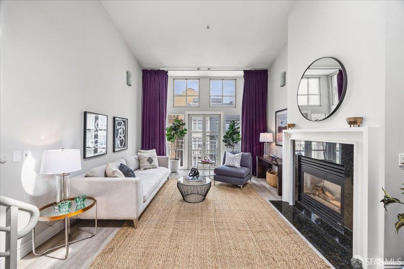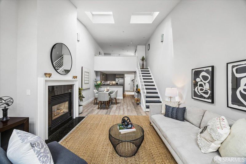 Located in vibrant Lower Nob Hill, this striking one-bed, two-bath loft condo offers a blend of modern sophistication and exceptional value. The expansive open-concept living/dining area is framed by a dramatic wall of French doors, skylights and soaring windows, bathing the space in natural light to create an airy ambiance. A sleek fireplace adds warmth to this refined urban retreat. The kitchen features granite counters, stainless appliances, and generous cabinet space. A full bath and laundry closet complete the main level. Ascend to the mezzanine bedroom, where skylights invite the morning sun and a private balcony offers a tranquil escape. The ensuite second bath enhances privacy and comfort. Residents enjoy access to a spacious common-area patio, an inviting venue for weekend BBQs and social gatherings. Additional amenities include one onsite parking, storage cage, Webpass internet, and Swiftlane video entry system. With a downtown location steps from shopping, restaurants, and cultural landmarks, this condo offers easy access to Civic Center, Hayes Valley, Union Square, Market St, Van Ness/101, MUNI, and BART. Whether you're seeking a stylish pied-a-terre, or full-time residence, this home delivers a balance of comfort, convenience, and cosmopolitan flair.