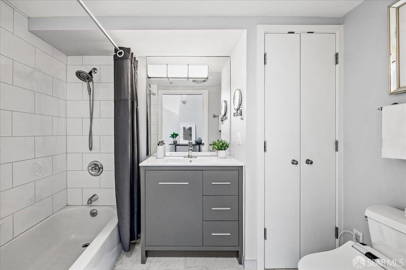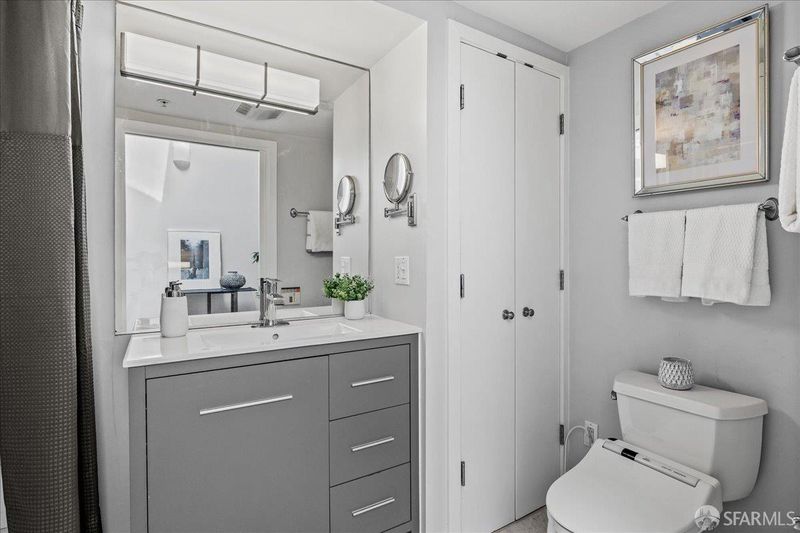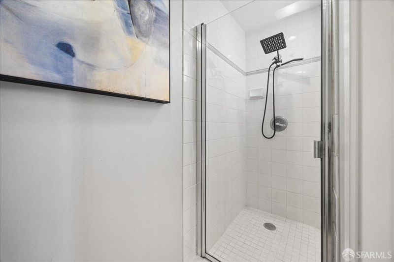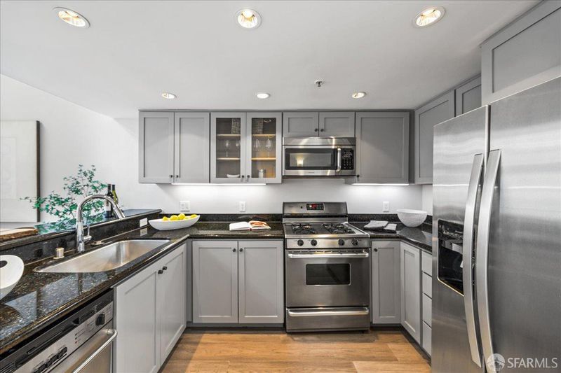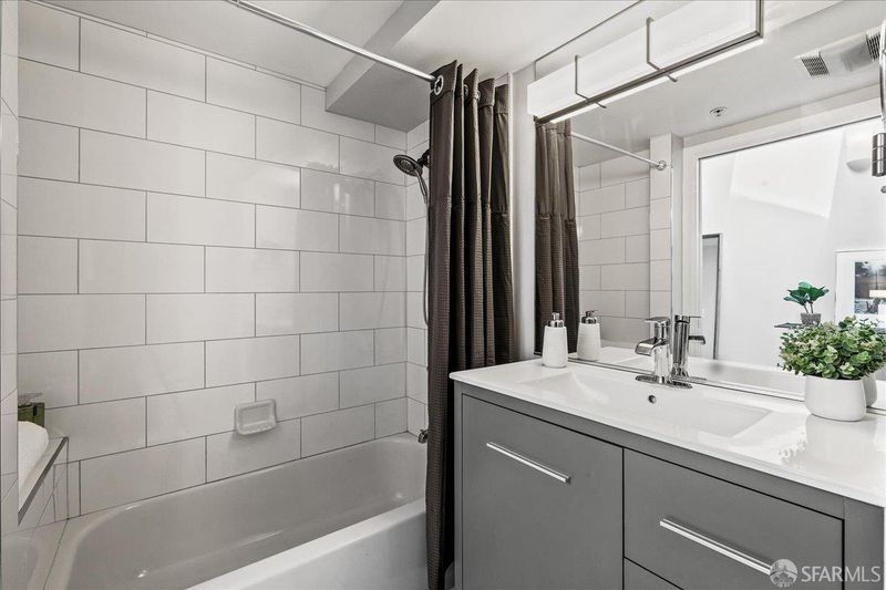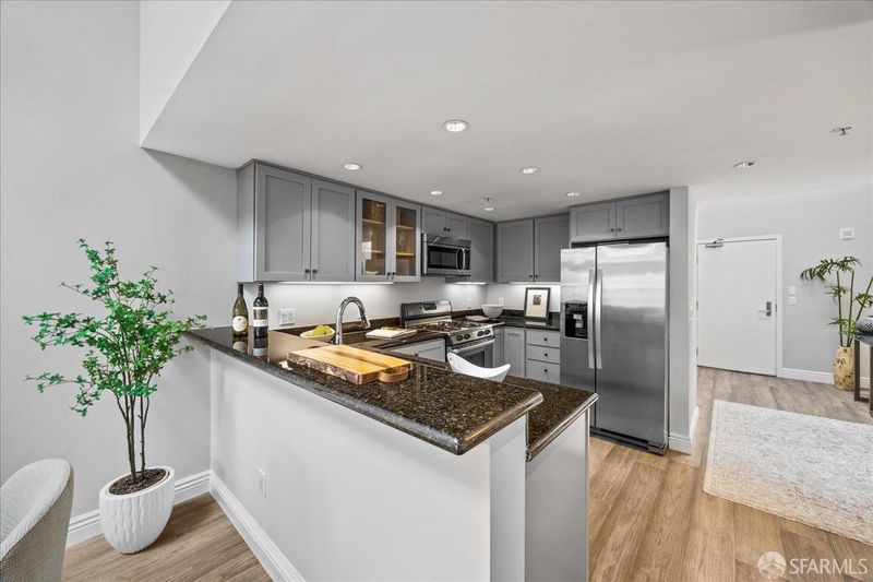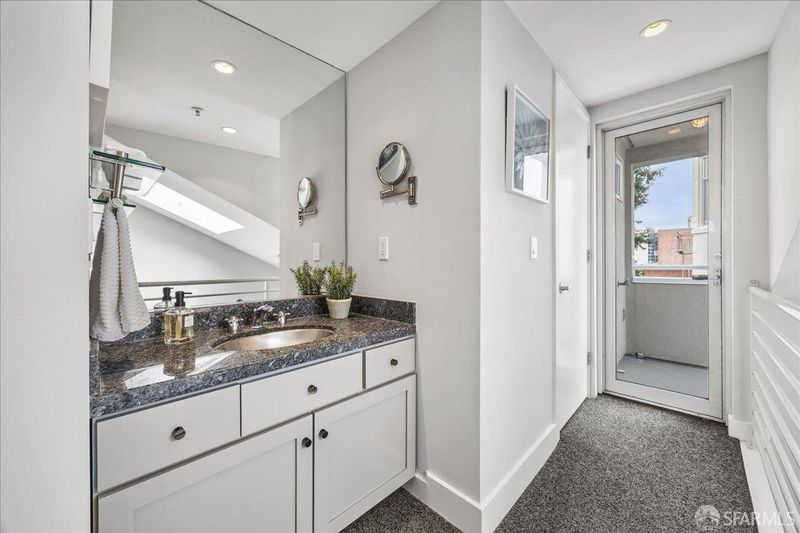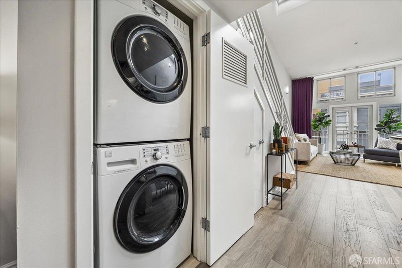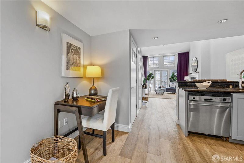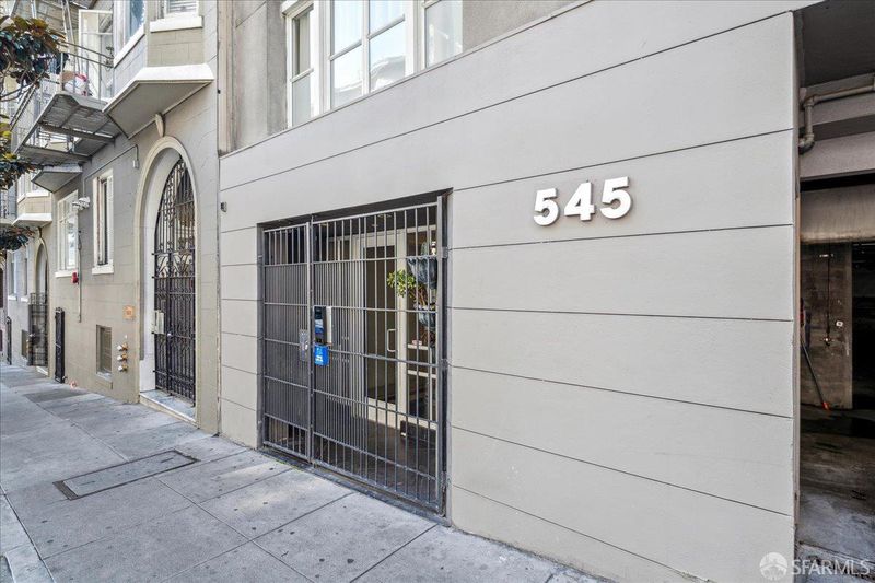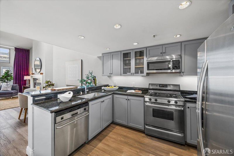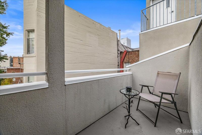 Located in vibrant Lower Nob Hill, this striking one-bed, two-bath loft condo offers a blend of modern sophistication and exceptional value. The expansive open-concept living/dining area is framed by a dramatic wall of French doors, skylights and soaring windows, bathing the space in natural light to create an airy ambiance. A sleek fireplace adds warmth to this refined urban retreat. The kitchen features granite counters, stainless appliances, and generous cabinet space. A full bath and laundry closet complete the main level. Ascend to the mezzanine bedroom, where skylights invite the morning sun and a private balcony offers a tranquil escape. The ensuite second bath enhances privacy and comfort. Residents enjoy access to a spacious common-area patio, an inviting venue for weekend BBQs and social gatherings. Additional amenities include one onsite parking, storage cage, Webpass internet, and Swiftlane video entry system. With a downtown location steps from shopping, restaurants, and cultural landmarks, this condo offers easy access to Civic Center, Hayes Valley, Union Square, Market St, Van Ness/101, MUNI, and BART. Whether you're seeking a stylish pied-a-terre, or full-time residence, this home delivers a balance of comfort, convenience, and cosmopolitan flair.