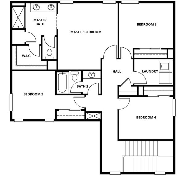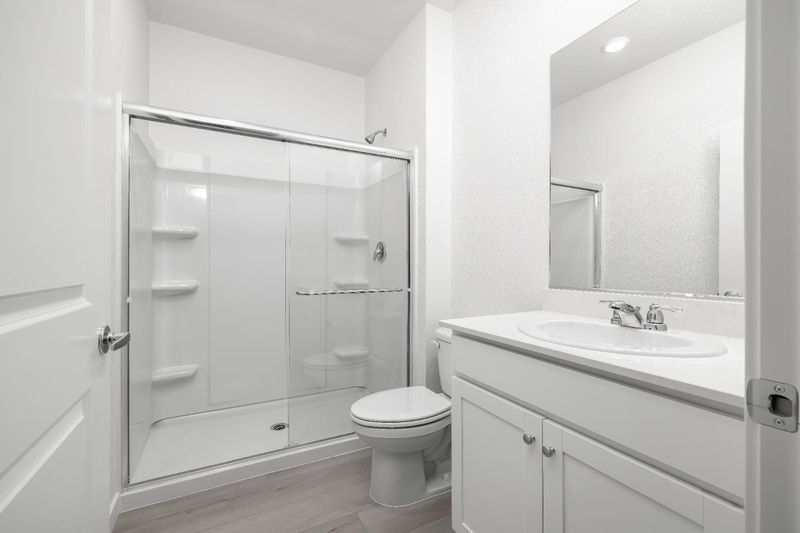 The Stinson floorplan masterfully blends space and convenience across its two stories, featuring five bedrooms and thoughtfully designed living areas. On the first floor, the heart of the home unfolds with an open layout that seamlessly integrates the kitchen, family room, and dining area, creating an ideal space for gatherings and daily living. The kitchen boasts a spacious walk-in pantry, perfect for keeping essentials within reach, and a full bathroom near the fifth bedroom adds versatility and ease. This downstairs bedroom can serve as a guest suite or a private office. The second floor is dedicated to four additional bedrooms, including a generous master suite that offers a retreat-like atmosphere. The master bath is elegantly appointed with a dual sink vanity and a step-in shower, enhancing the sense of luxury. A large laundry room adds to the home's functionality, while the secondary bathroom is well-equipped with a sizable vanity and a convenient tub/shower combination, accommodating the needs of the whole household.