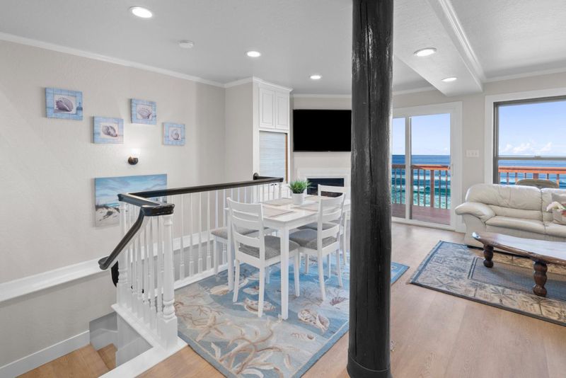 Step into your dream beachfront home, just steps from the sand and surrounded by miles of stunning coastline to explore and enjoy. Extensively remodeled in 2024, this property offers the perfect blend of modern updates and coastal charm, ready for you to move in and start living the good life. As you enter, you're greeted by soaring ceilings and an abundance of natural light, enhanced by a skylight. The main level features two spacious bedrooms, each with bay windows framing breathtaking ocean views, and a beautifully updated full bathroom with elegant porcelain floors and walls. On the mid-level, you'll find an inviting living room with a cozy gas fireplace, a stylish dining area, and a kitchen that will delight any chef. The kitchen boasts sleek quartz countertops, brand-new appliances, and ample space for entertaining. Step out onto the south-facing deck to soak in sweeping views of Monterey Bay, where you can watch whales, dolphins, and other sea life in their natural habitat. The lower level offers an additional bedroom with its own outdoor access, leading to a walkway and direct stairway to the beach. Whether you're enjoying the home as a serene personal retreat or leveraging it as a vacation rental, this property is a rare gem offering both relaxation and potential income.