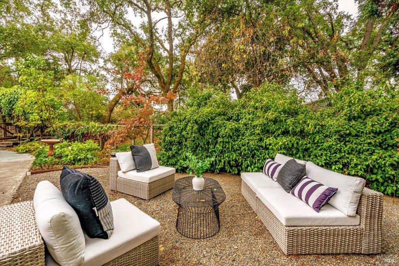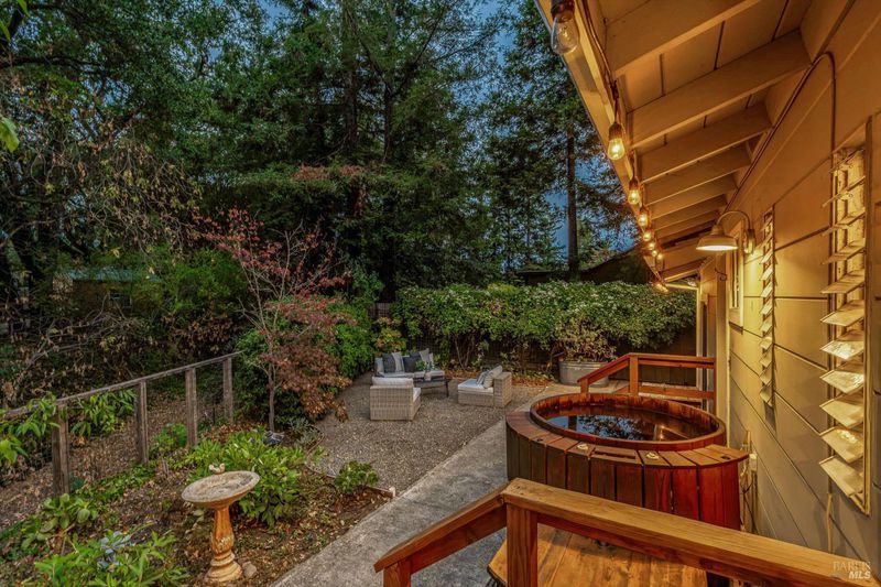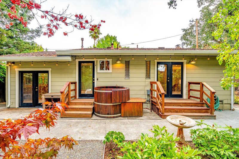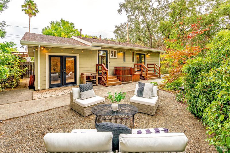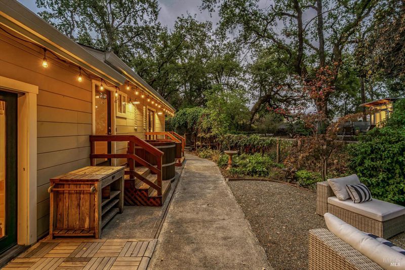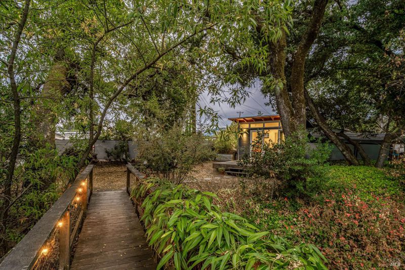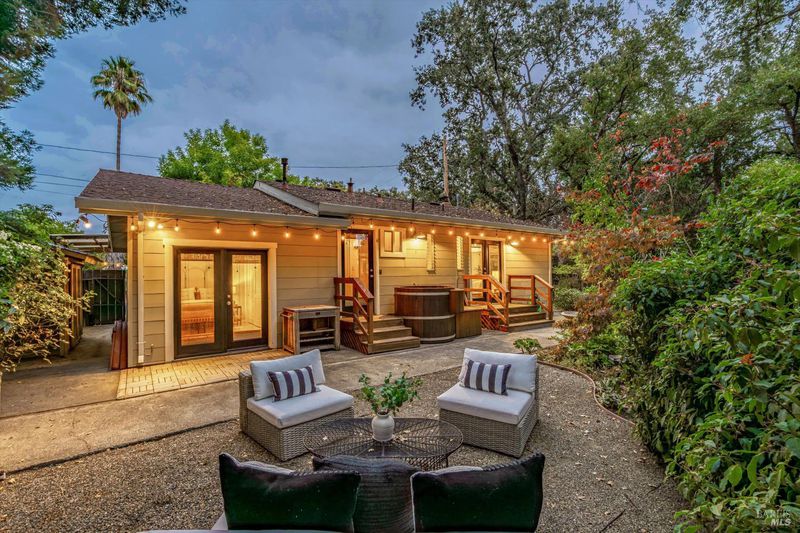 Don't miss this romantic Wine Country retreat in the heart of Sonoma! Set on a generous lot with enchanting views from every window, this private home blends rustic charm with modern comfort. Vaulted ceilings, French doors, and rich wood and tile floors fill the interiors with warmth and natural light. A spacious living area with fireplace creates an inviting setting for everyday living or entertaining. The kitchen offers excellent scale for cooking and gathering, with seamless indoor/outdoor flow. Retreat to the generous primary suite or welcoming guest bedroom, each with private yard access and a soothing hot tub just steps away. When evening falls, the landscaped grounds transform into your own private wonderland with ambient lighting, a darling footbridge over the seasonal creek, and an additional entertaining space with artist studio or office. Low-maintenance, lush landscaping maximizes privacy while keeping upkeep simple. Ideally located near shopping, dining, and Sonoma's historic Plaza, yet offering the peace and tranquility of country living, this home is truly a special place to call your own.