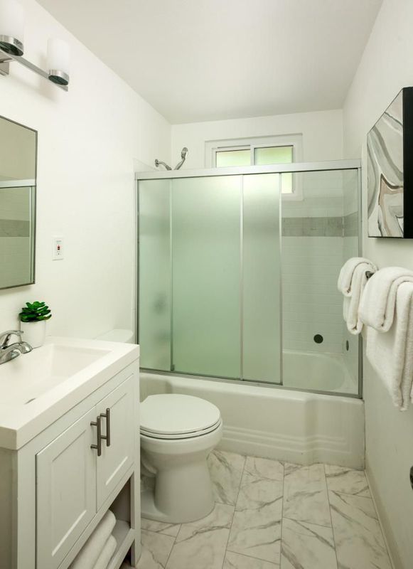 - Full on Ground Floor, Primary - Stall Shower(s), Showers over Tubs - 2+, Skylight, Tile