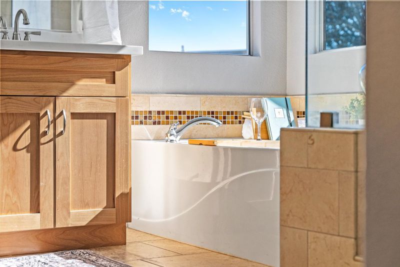 - Double Sinks, Half on Ground Floor, Primary - Oversized Tub, Shower over Tub - 1, Tub with Jets, Updated Bath