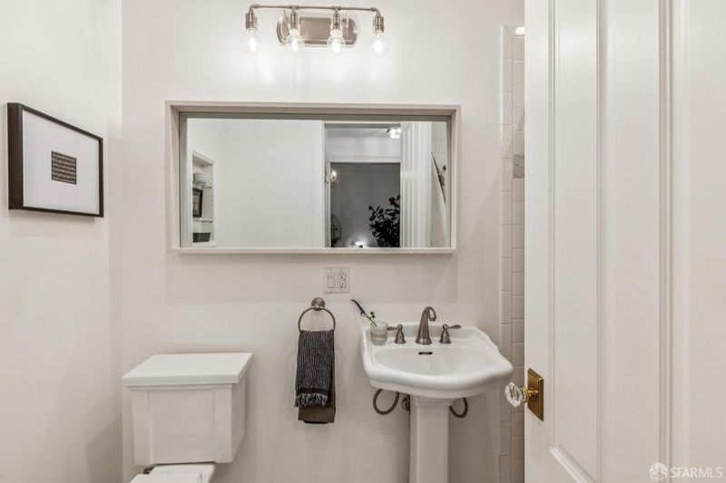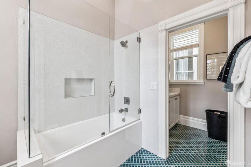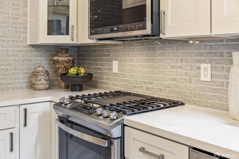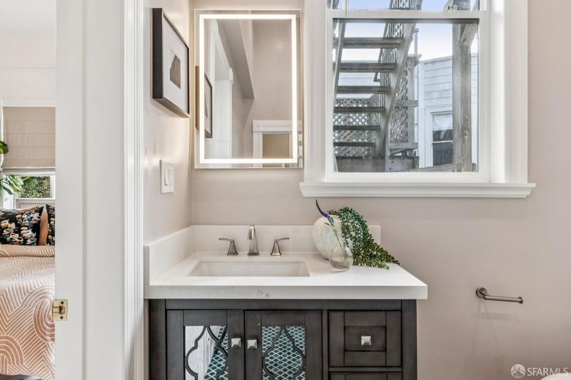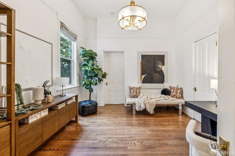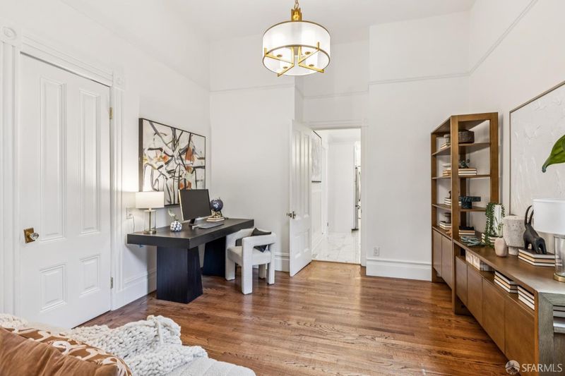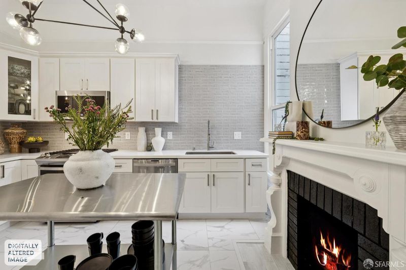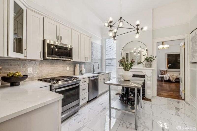 This beautifully renovated Victorian condo blends timeless architectural charm with modern comfort. Soaring ceilings, intricate crown moldings, medallions, and a gracious bay window define the expansive living/dining area, where hardwood floors and a fireplace create a warm, inviting setting for entertaining. The open layout flows into a spacious kitchen featuring porcelain flooring, quartz countertops, stainless appliances, a generous island, and a rare wood-burning fireplace. An unexpected focal point for cozy evenings. Two well-proportioned bedrooms accommodate furnishings of any scale. The secondary bedroom sits near an updated bath with chevron tile and a walk-in shower. Privately positioned at the rear, the primary suite is buffered by a versatile sitting room ideal as a home office or media lounge. Newer double-pane windows frame leafy outlooks toward Buena Vista Park and open to exclusive-use rear decking. The primary bath offers a glass-enclosed soaking tub and connects to a utility room with stacked washer/dryer and ample storage. Stairway from primary leading to a shared garden plus an exclusive-use deck for afternoon lounging complete this exceptional home.