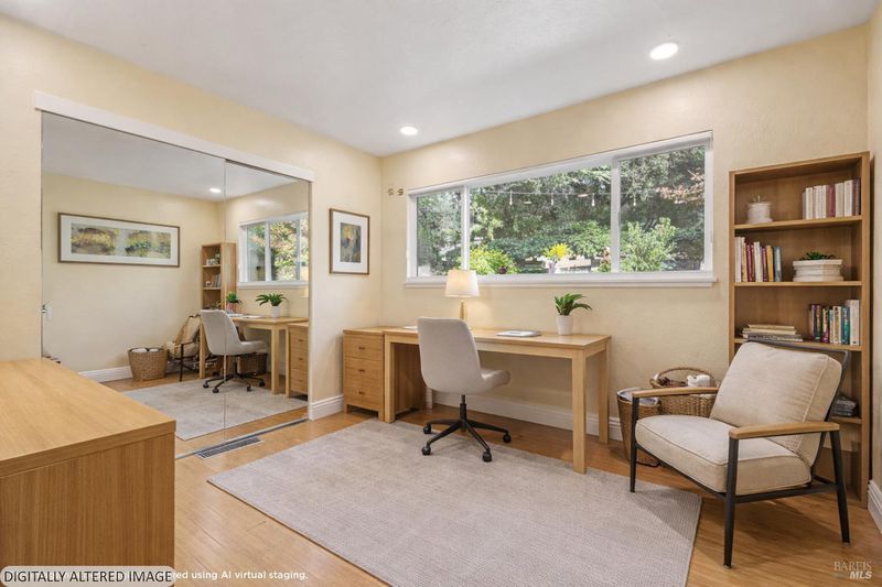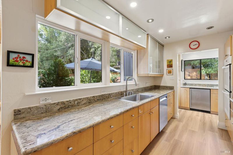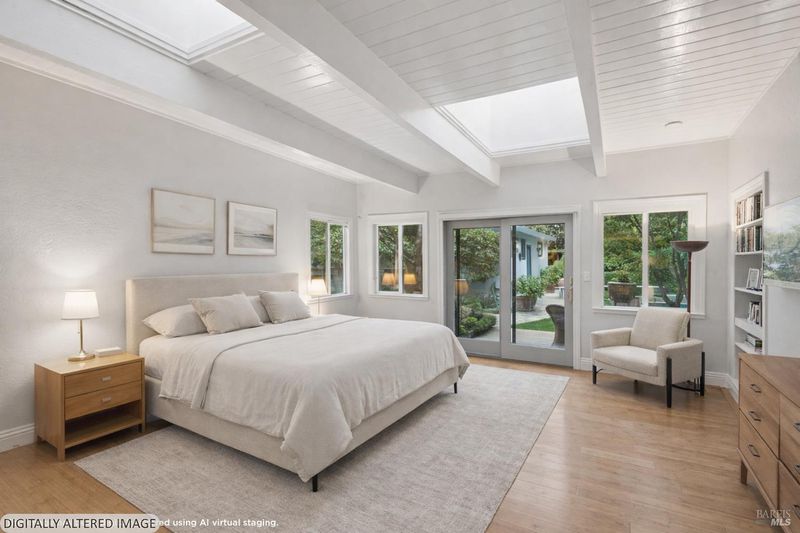 Park-like grounds surround renovated, single-level Mid-century home on a hidden lane one block from downtown. Approx. .85 acre includes adjoining parcel. Lush retreat features fruit trees, flowers, topiary and shaded sitting areas that flow between patios, gardens with fountains and a sparkling pool. Gated, pavered drive leads to the light-filled 3BD/3BA home with vaulted ceilings, skylights, and bamboo-style floors. Open plan with gas fireplace and walls of glass connects seamlessly to the outdoors. Modern kitchen situated for entertaining indoors or out: ample slab counters, flat-panel cabinetry, stainless appliances, dual sinks, and skylit butler's pantry. Large primary suite enjoys a sitting area, built-ins, full bath with walk-in shower and outdoor access. The guest wing has two generous bedrooms with built-ins, picture windows and an updated full bath. Raised beds for produce and cut flowers, chicken coop, outbuilding, full outdoor bath. Efficiency: new solar/29 panels, 9 Enphase batteries (warranty to 2034), new electrical panel + public utilities. Stroll to grocery stores, tasting and dining and Sonoma Valley Regional Park. Minutes to Sonoma Plaza, 1+/- hour to San Francisco.