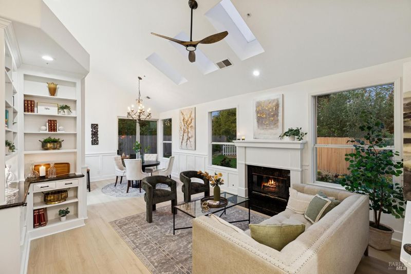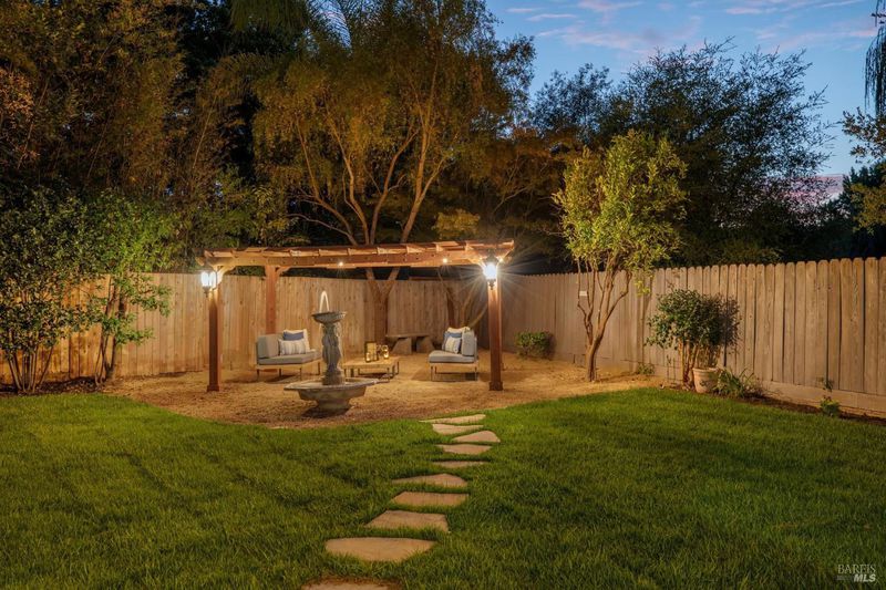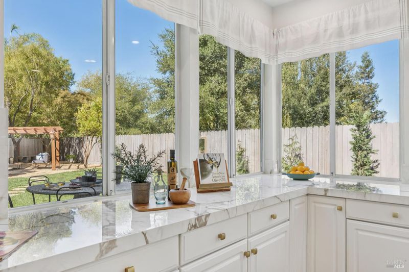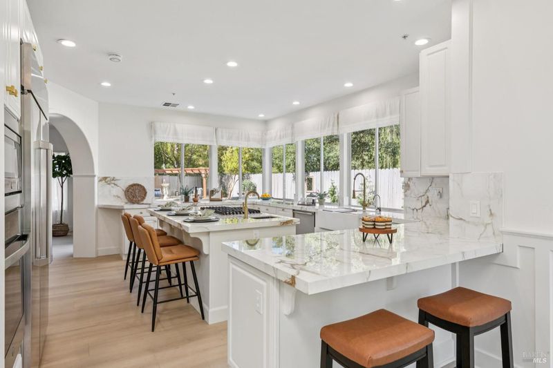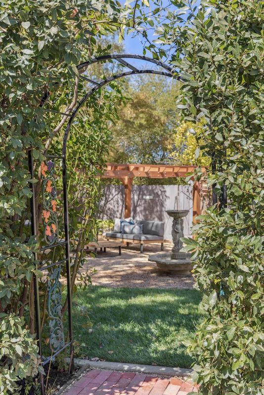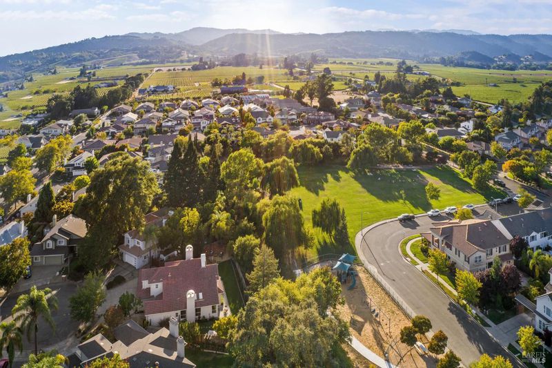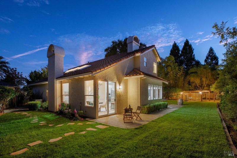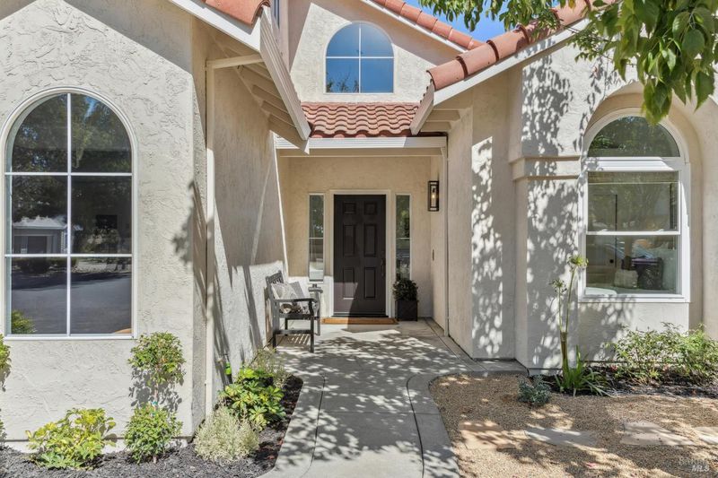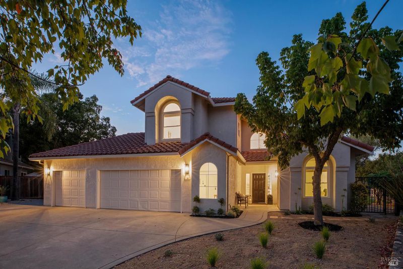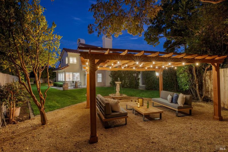 Tucked away at the end of a cul-de-sac in desirable North Napa, this elegant light-filled home is a show-stopper. With its soaring ceilings and 5 +/- foot-tall kitchen windows overlooking the park-like back yard, this home brings the outdoors in. A dreamy kitchen features an abundance of new porcelain counter space, a center island, a workstation sink, new KitchenAid gas stovetop, built-in fridge and walk-in pantry. The kitchen is open to both the family room and the living/dining rooms. Living and dining spaces are enhanced with wainscoting and a gas fireplace. Perfect floorplan with a high-ceilinged bedroom and full bath on the main level, and 3 more BRs upstairs, including the elegant primary suite. The recently remodeled primary bathroom's double-sided fireplace & soaking tub create a relaxing retreat. In the back yard, there's a new pergola with party lights on one side, and a veggie garden on the other. A neighborhood playground is accessible from the back gate and is just a few yards away. Too many upgrades to list, including a new HVAC system. A 3-car garage and RV parking are the icing on the cake. Hop on the Vine Bike Trail, just a few blocks away, and head to Yountville! Just 3/4 mile to one of Napa's most beloved restaurants. This is the ideal Napa Valley lifestyle!