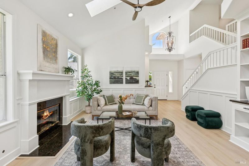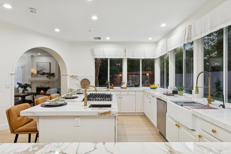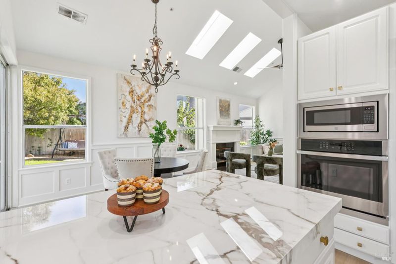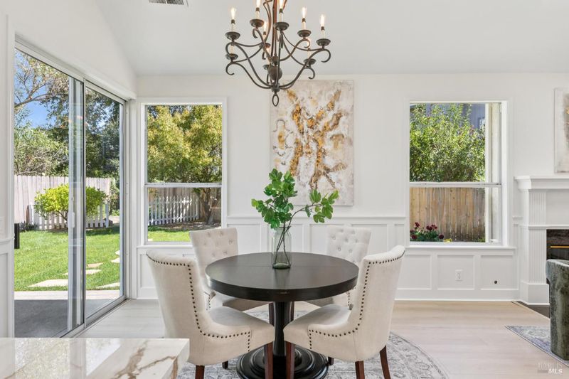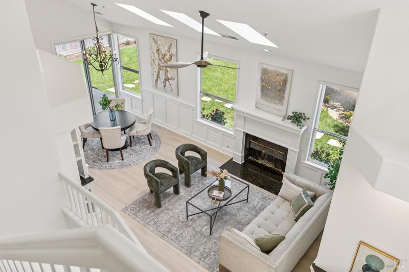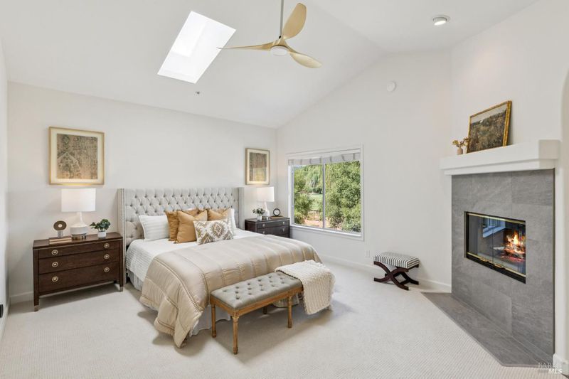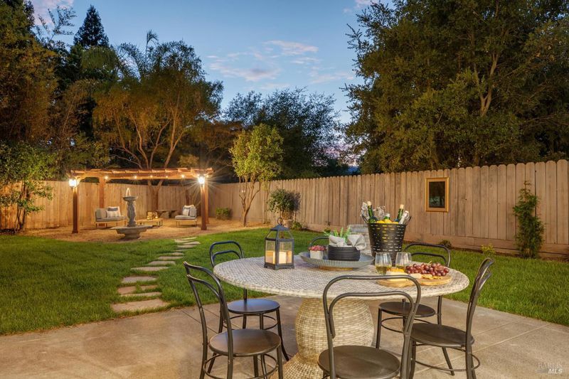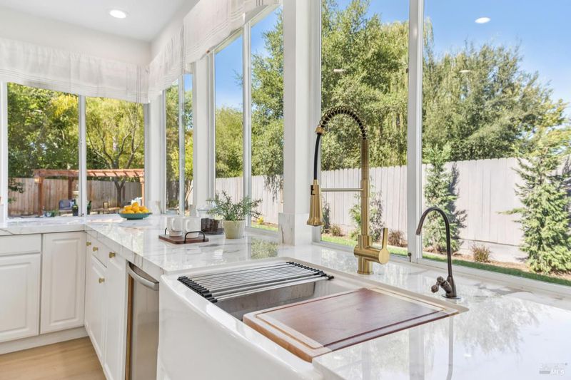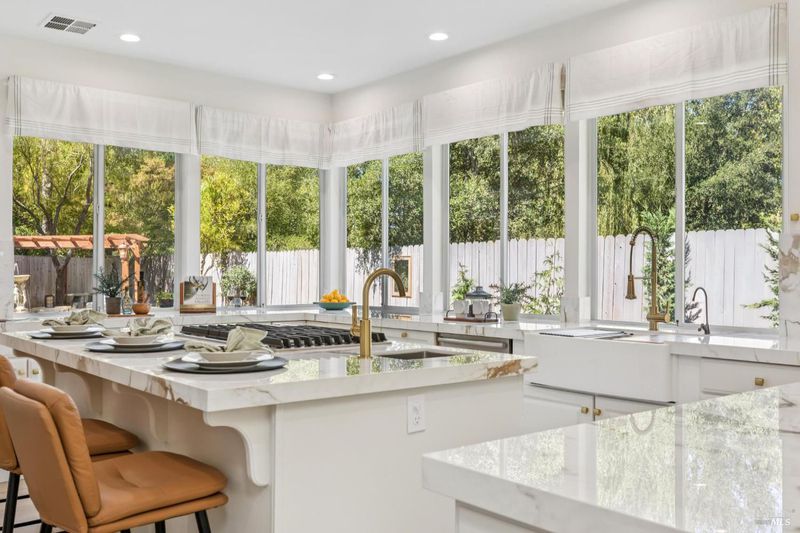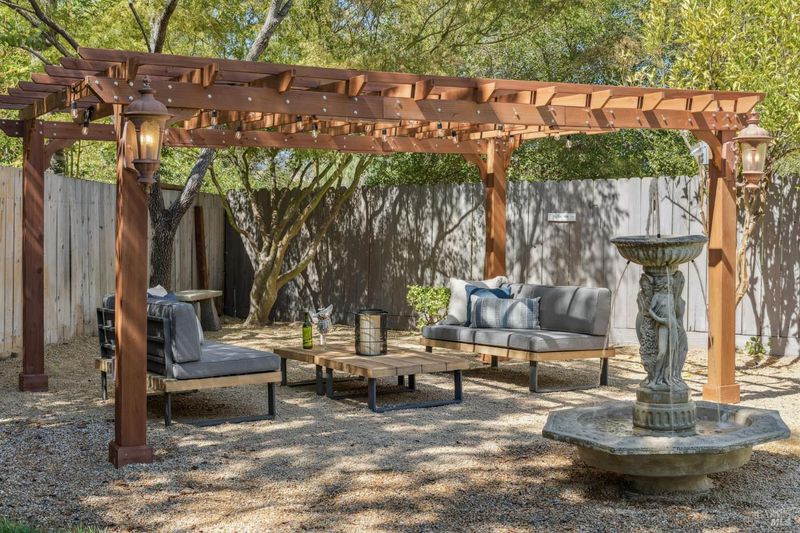 Tucked away at the end of a cul-de-sac in desirable North Napa, this elegant light-filled home is a show-stopper. With its soaring ceilings and 5 +/- foot-tall kitchen windows overlooking the park-like back yard, this home brings the outdoors in. A dreamy kitchen features an abundance of new porcelain counter space, a center island, a workstation sink, new KitchenAid gas stovetop, built-in fridge and walk-in pantry. The kitchen is open to both the family room and the living/dining rooms. Living and dining spaces are enhanced with wainscoting and a gas fireplace. Perfect floorplan with a high-ceilinged bedroom and full bath on the main level, and 3 more BRs upstairs, including the elegant primary suite. The recently remodeled primary bathroom's double-sided fireplace & soaking tub create a relaxing retreat. In the back yard, there's a new pergola with party lights on one side, and a veggie garden on the other. A neighborhood playground is accessible from the back gate and is just a few yards away. Too many upgrades to list, including a new HVAC system. A 3-car garage and RV parking are the icing on the cake. Hop on the Vine Bike Trail, just a few blocks away, and head to Yountville! Just 3/4 mile to one of Napa's most beloved restaurants. This is the ideal Napa Valley lifestyle!