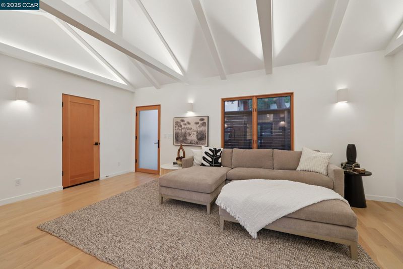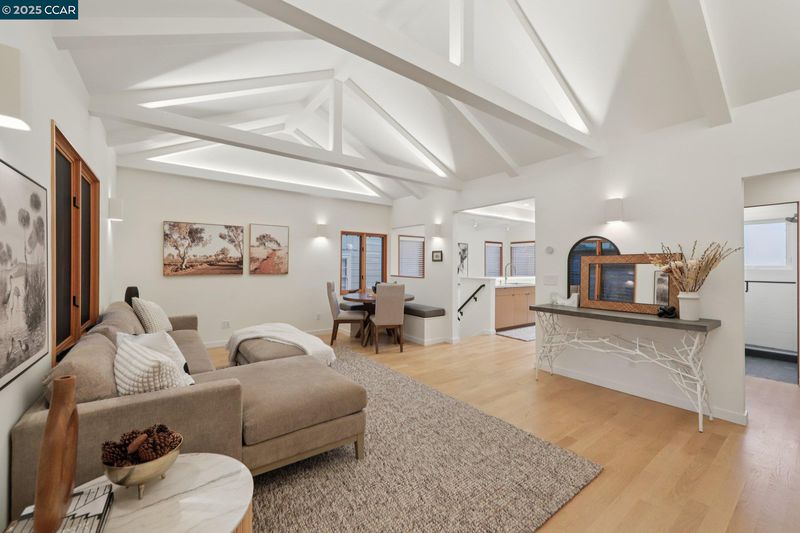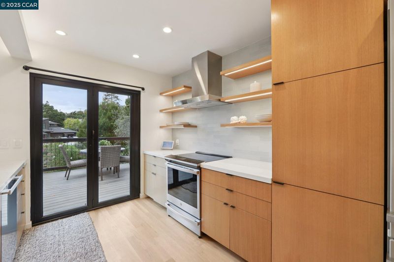 Discover eco-modern living in this 3BR/2BA Berkeley Hills home, where smart technology meets comfort. A Google Nest system, six-zone radiant heating/cooling, and passive ventilation ensure an ideal climate. Vaulted ceilings and soft LED lighting create a bright, welcoming atmosphere, while the chef’s kitchen features custom cabinetry, high-end appliances, and open shelving. The main level includes a bedroom with peaceful views, a home office with built-in desk, and a spa-inspired bathroom. An attached garage with EV charger is finished as additional living space. The lower level offers a family room perfect for entertaining, opening to a ~400 SF patio and multi-tier, low-maintenance yard, along with two bedrooms, a full bath, laundry, and storage. Ideally located near UC Berkeley, Kensington shops, Solano Avenue, Tilden Park, and AC Transit.