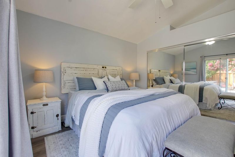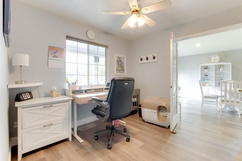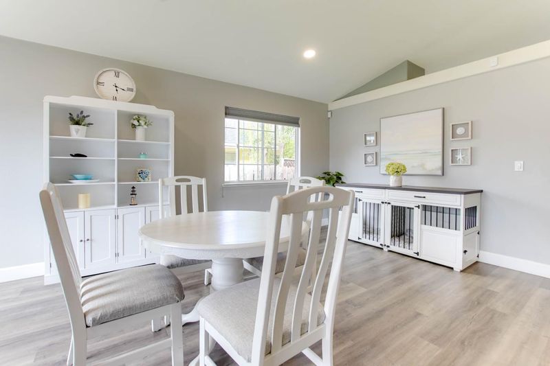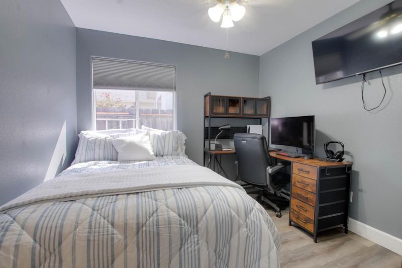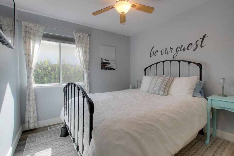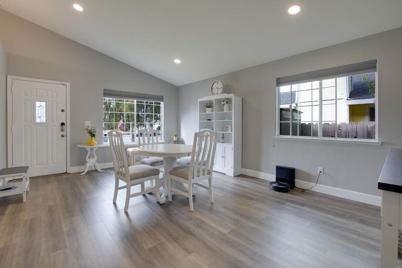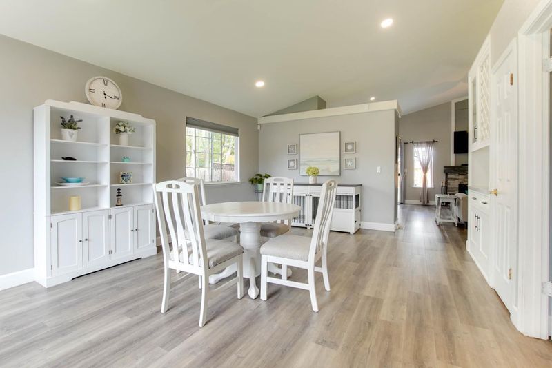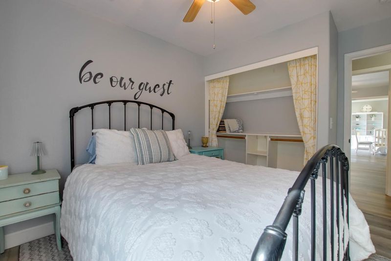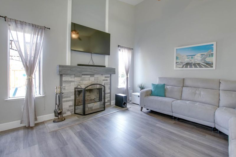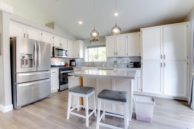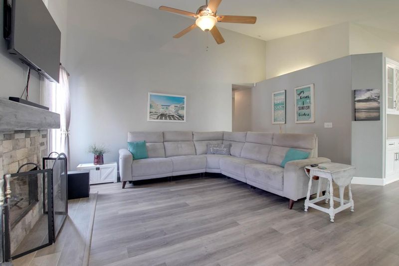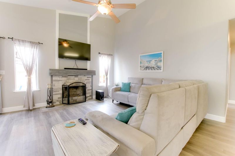 This home welcomes you with a front porch to enjoy your morning or evening coffee or tea. then inviting you into this 4-bedroom, 2-bathroom home spanning 1,525 square feet and offers a perfect blend of comfort and functionality. The open-concept kitchen, featuring quartz countertops, an exhaust fan, and built-in oven range, and island for cooking prep seamlessly integrates with the family room which has a wood burning fireplace for warming those cool evenings, creating a welcoming space for gatherings. The dining area resides within the living room, enhancing the home's flow and usability. This home boasts laminate flooring throughout, adding a touch of modern elegance. Laundry is conveniently located inside, simplifying household chores. The home includes essential amenities such as high ceilings and a 2-car garage for ample storage and parking. Beautifully landscaped with lots of patio areas for fun gatherings with family and friends.