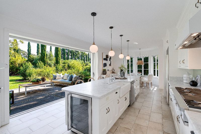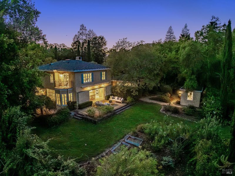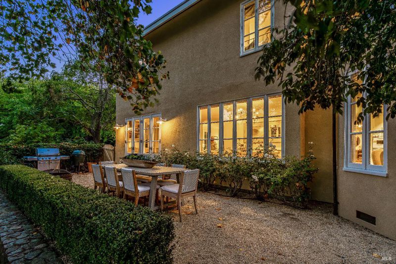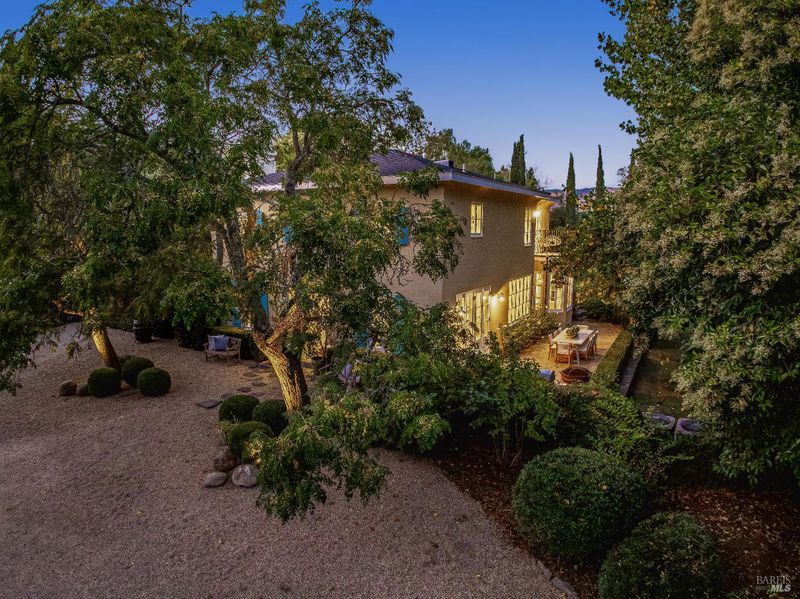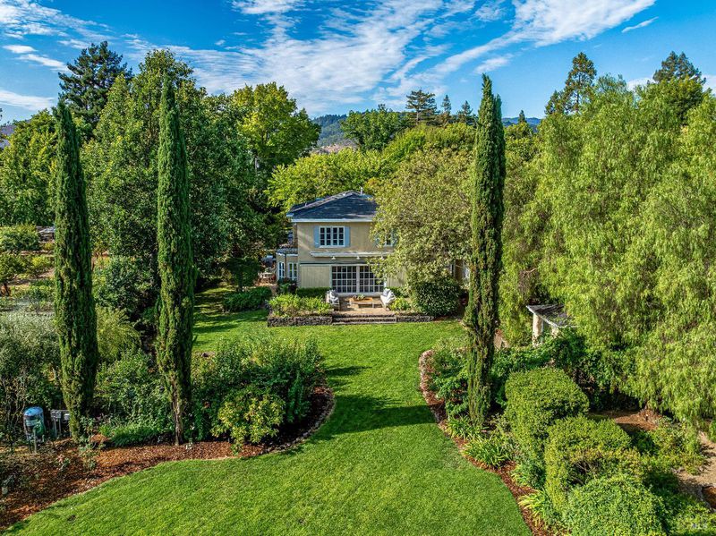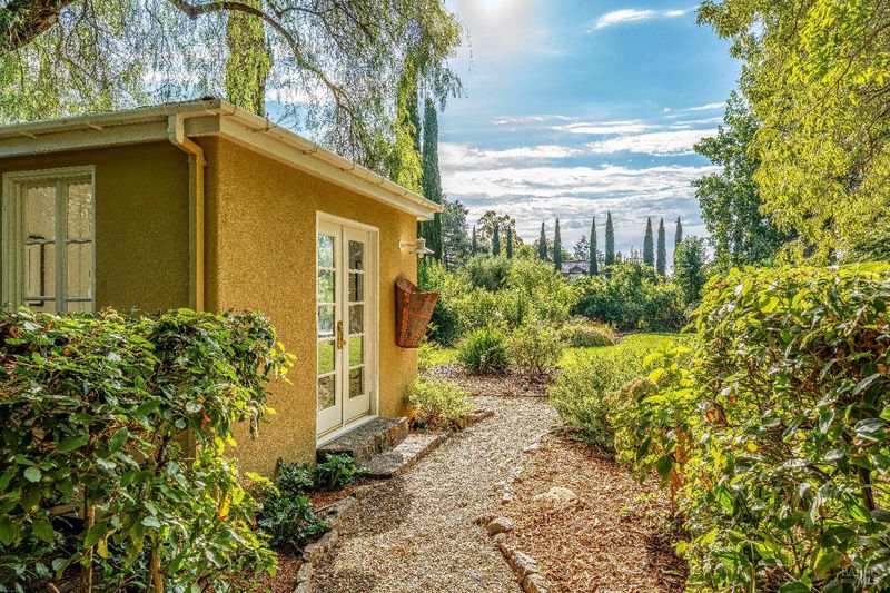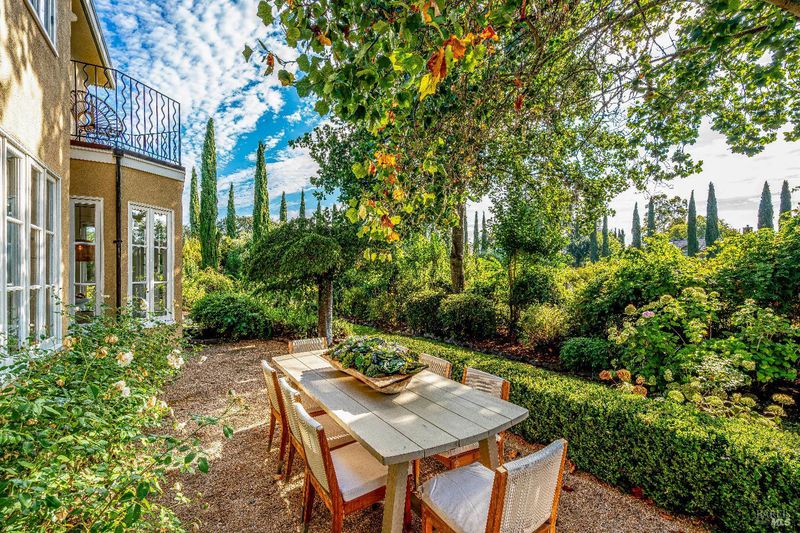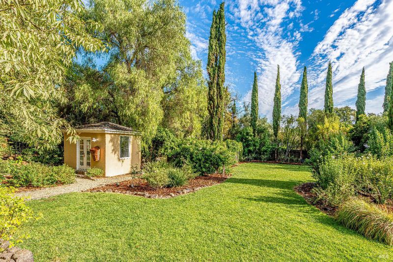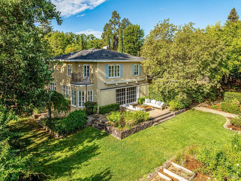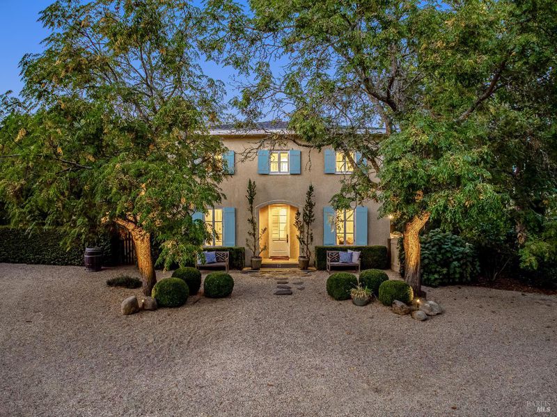 A rare jewel in the heart of town, this French country farmhouse is a sanctuary of elegance and ease. Arrive through a tree-lined alle into an inviting motor court where the handsome faade and timeless shutters give way to interiors reimagined by Howard Backen with exquisite craftsmanship. Sunlight dances across fir floors, filling spaces designed for connectiona living room with fireplace, a dining room that spills onto a terrace, perfect for alfresco dining, and a dream kitchen with pocketing doors open to the rear lounging terrace. Upstairs, the primary suite offers balcony views and a marble-clad bath while 3 additional bedrooms provide guest accommodations. A bright family room invites relaxation, and an extra room with bath suits staff or office use. Beyond the walls, expansive lawns, towering cypress trees, and lush gardens invite quiet contemplation and farm-to-table living, while a play structure, gym/office outbuilding, and storage shed add thoughtful versatility. Blending rustic charm with refined sophistication, this Yountville oasis is a retreat to savor, offering the grace of country living with the vibrancy of Yountville's world-class dining just moments away.
