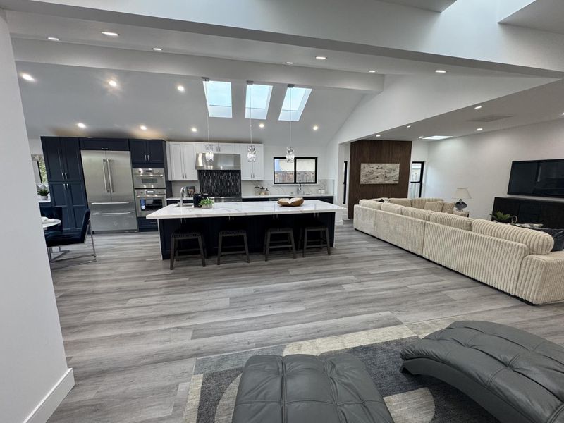 This completely reimagined 3-bedroom, 3-bathroom home has been remodeled down-to-the-studs which expanded by 650 permitted SF showcases a seamless blend of modern luxury and thoughtful design. Everything is new. High-end upgrades and designer finishes throughout, a truly turnkey and move-in ready. At the heart of the home is a chef's kitchen that boasts vaulted ceilings and multiple skylights, flooding the space with natural light. A massive center island anchors the kitchen, which is outfitted with top-of-the-line Thermador appliances, including a built-in refrigerator, commercial-grade 6-burners gas range, microwave, and dedicated wine and beverage fridges perfect for entertaining or everyday gourmet cooking. A dramatic 16-foot, 4-panel folding patio door that opens completely to the spacious backyard, creating the ideal setting for indoor-outdoor living and entertaining. Sleek, flat Venetian-style wall finishes, all-new modern bathrooms, a new HVAC system, inside laundry area. The home also features a brand-new roof, smooth stucco exterior, Milgard windows, and fully insulated walls. A whole-house water softener and tank less water heater. An upgraded 200-amp electrical panel and 2 EV chargers in the garage. Stylish, functional, and perfectly located in a peaceful cul-de-sac.