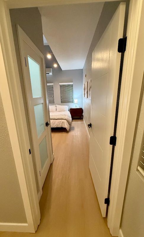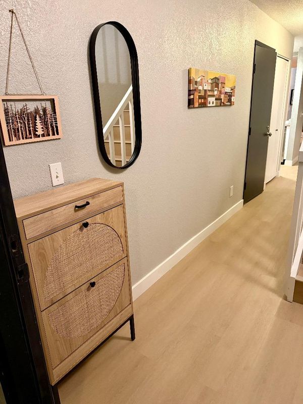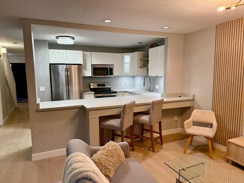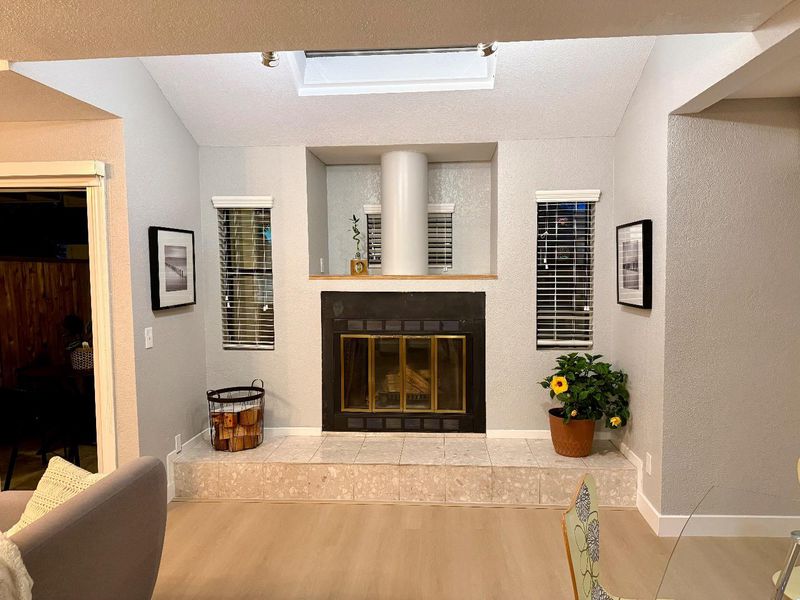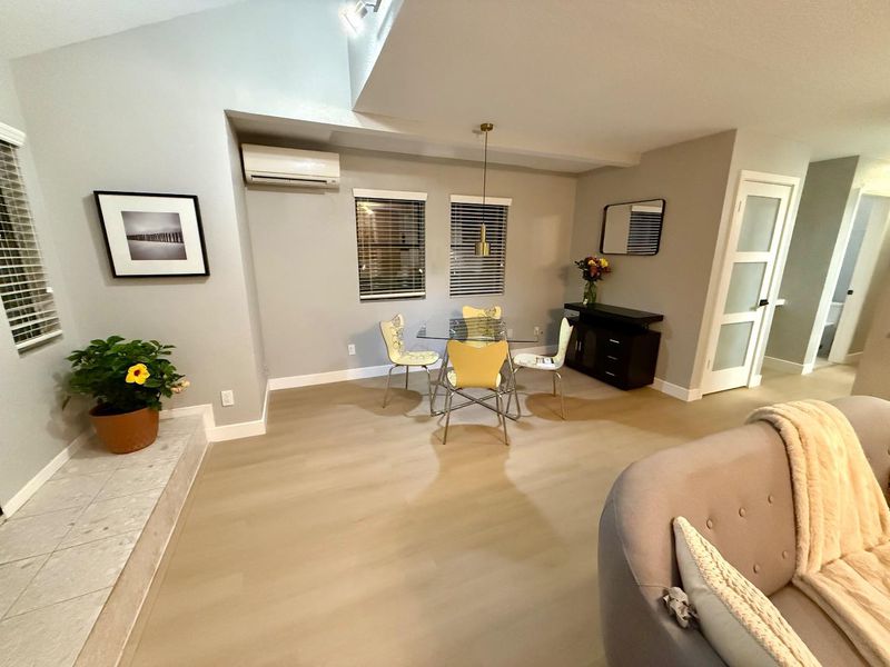 THIS IS THE ONE!! Welcome to a stunning completely updated end unit in a boutique complex in Mountain View, Lucky #7, offering 3 bedrooms and 2 1/2 bathrooms professionally designed with cathedral ceilings. The updated kitchen is a culinary haven equipped with modern amenities such as Stainless steel appliances, an electric range, dishwasher, wine refrigerator, farm sink, beverage station and an island, making meal preparation a breeze. Enjoy the multi-zone cooling and Energy Star HVAC, ensuring comfort throughout the seasons. Start your day at the coffee/beverage station and head back upstairs to your private balcony. Great way to start or end a day with your favorite beverages . Have some friends over to unwind in this lovely private backyard. End your day in your private en-suite retreat complete with fireplace. This unit has plenty of room for a home office for working from home and a separate guest bedroom. The home boasts so many updates including brand new tile flooring in bathrooms and waterproof/scratch resistant wood looking LVP quality materials throughout. This is a must see. The last two 3 bedroom units in this complex sold for $1.5 without updates and $1.8 completely updated. Experience the community this weekend and stop by the SAT Open House for Affogato.