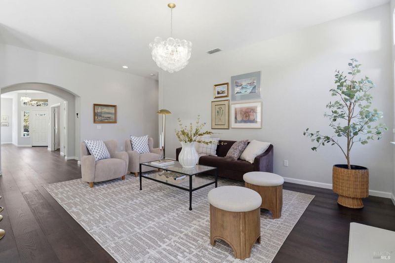 Soaring 10-ft ceilings & clerestory windows fill this beautifully updated 2,455 sq ft single-level home with natural light. The open floor plan features 4 bed/2 bath, hardwood floors, a remodeled kitchen with Z-Line appliances & gas range, plus two fireplaces & an expansive family room. The primary suite offers a walk-in closet, en suite bath with soaking tub & skylight. Central A/C, high-capacity LG washer/dryer with Sidekick drawer & attached 2-car garage complete the package. Professionally landscaped for privacy — a rare single-story retreat among two-story neighbors. The spacious backyard is ideal for al fresco entertaining. Steps to parks, bike paths, tennis, pickleball, a pond & the Petaluma Wetlands Park. Weekly farmers market nearby & Petaluma Transit connects to the Larkspur Ferry for a scenic commute to SF. Farm-fresh living, historic charm & Wine Country proximity — this address is as distinguished as the home itself.