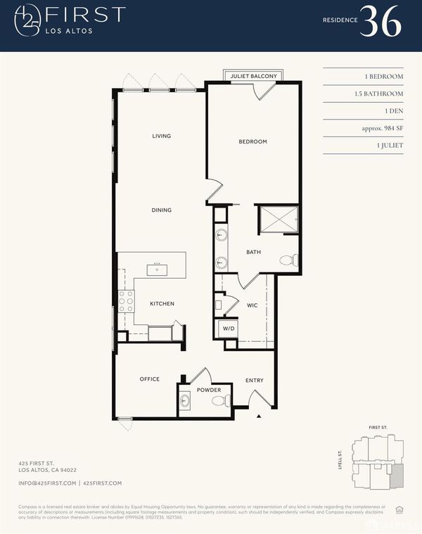 Residence 36 at 425 First Street is a corner one-bedroom plus den home featuring a generous living & dining area, kitchen island, and 2 bathrooms. 425 First is a boutique development of 20 luxury condominiums in downtown Los Altos. Located just two blocks from Main Street, these residences embrace the dynamic Los Altos lifestyle. Newly constructed, the residences at 425 First showcase modern, open floor plans with an abundance of natural light that illuminates the thoughtfully designed sleek interiors. The homes boast high ceilings, wide-plank European Oak hardwood flooring, modern European-style custom cabinetry, and Dacor professional stainless-steel appliances with a dual-fuel gas range. Laundry hook-ups and 1 car parking with EV charging completes this home. *All photography, renderings & views are representative of the Development and may not be the photos of the actual home.*