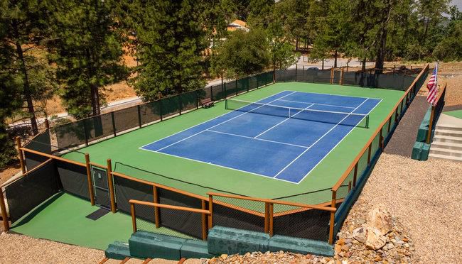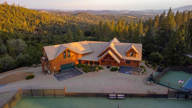 Luxury investment property! Dare to dream BIG with this 8,000+ sq. ft. of log lodge architecture on 5 hilltop acres in Murphys, located between Lake Tahoe & Yosemite National Park. Award winning B&B Inn built by Bay Area tennis pros with Western Red Cedar logs from Oregon, this meticulously maintained property is a 5-star-rated luxury retreat, perfect as a private estate, vacation rental, duplex, or boutique inn. Features include suites with ensuite bathrooms, professional kitchen, 23' Great Room with 10' stone fireplace & wet bar, loft/library, game room, office/den, XL laundry room, massage parlor, & private apartment with second kitchen, living/dining space, office, bathroom, & separate entry. Two regulation size tennis courts, dual EV charging stations, Tesla Powerwalls, quadruple water filtration system, 2 central A/C & heat pumps, 8 mini-splits, & whole-house Generac generator (2023). Landscaped with drought resistant plants & water is sourced from on-site well for the fruit trees, herbs, edible plants & vegetable gardens, & is filtered for personal use. Come experience this one-of-a-kind architectural beauty with sweeping 360 views.