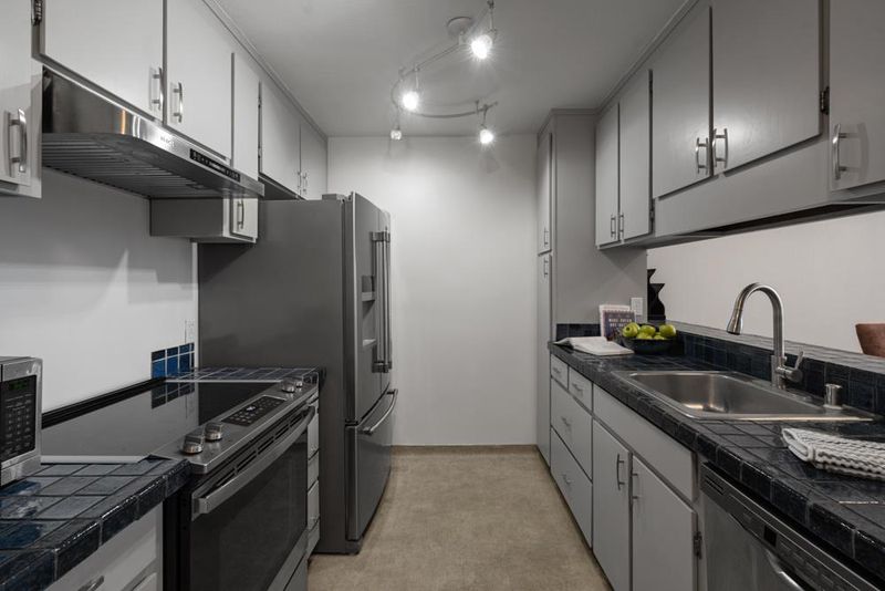 - Countertop - Tile, Dishwasher, Exhaust Fan, Garbage Disposal, Hood Over Range, Ice Maker, Microwave, Oven - Self Cleaning, Oven Range - Electric, Refrigerator