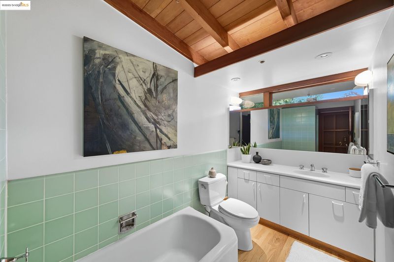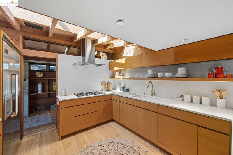 Designed in 1953 by architect Morgan Shaw, this mid-century modern home captures the essence of California design with seamless indoor-outdoor flow, original redwood walls, and floor-to-ceiling low-E glass framing iconic views of the Golden Gate, Bay Bridge, and Richmond-San Rafael. Later enhanced by architects Bill Glass and Bennett Christopherson, the home combines architectural pedigree with thoughtful modern upgrades. The kitchen and dining room, reimagined in 2016 by Mason St. Peter, feature custom millwork by Nobuto Suga of Small Works, while a vintage Cado Poul Cadovius wall unit provides both style and function. A serene lower-level primary suite includes a custom solid oak dressing room. Modern systems include a 200-amp electrical panel, dual Tesla Powerwalls, full solar, EV charger, LED lighting, and discreet hidden home cinema. Outdoor living shines with a level-in backyard featuring an Ipe deck, Galanter & Jones heated bench, plumbed Lumacast fire pit, Japanese Maple, fruit trees, and vegetable garden, all designed by Heather Reid. Recently repainted, with a two-car garage and proximity to Tilden Park, UC Berkeley, and North Berkeley shops, this rare home offers a perfect blend of history, design, and sustainability.
