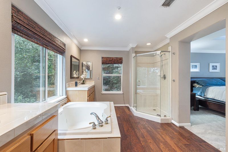 Double Sinks, Jetted Tub, Shower Stall(s), Tile, Walk-In Closet, Window