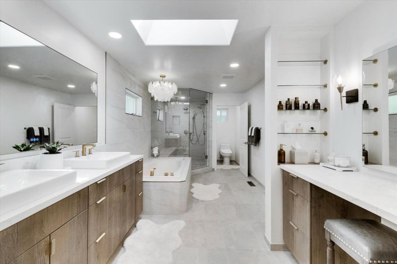 - Double Sinks, Full on Ground Floor, Primary - Oversized Tub, Primary - Tub with Jets, Shower and Tub, Shower over Tub - 1, Stall Shower - 2+, Steam Shower, Tub in Primary Bedroom, Tubs - 2+