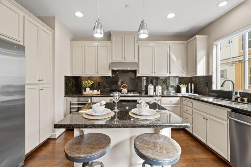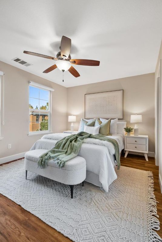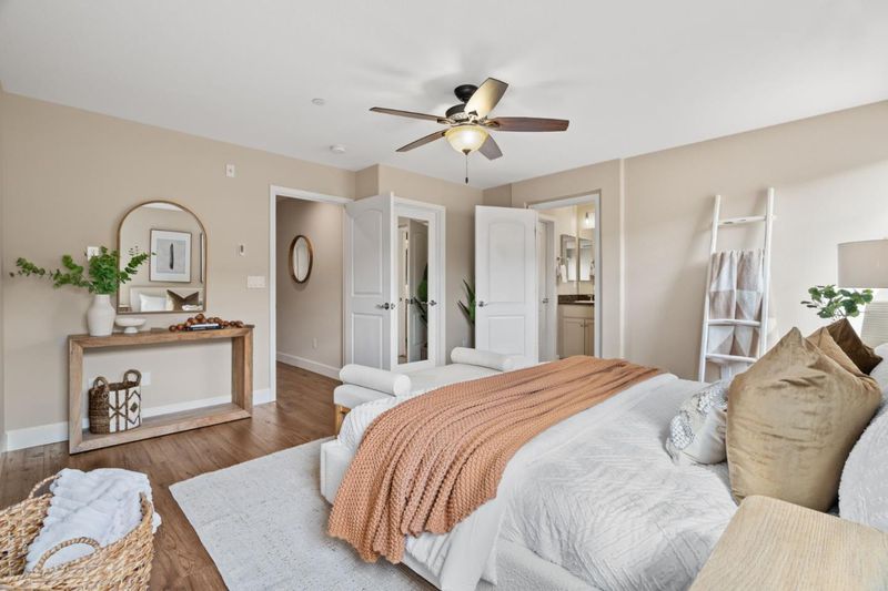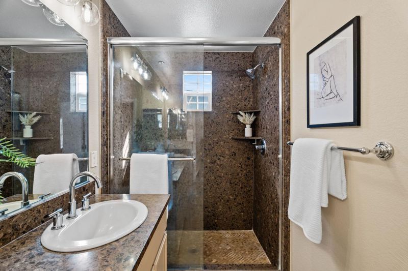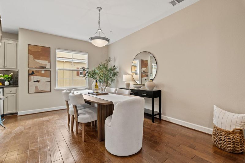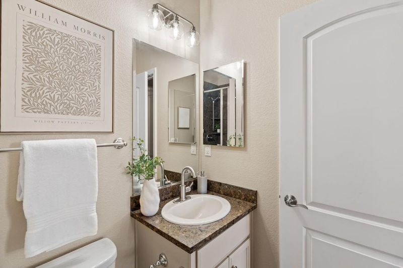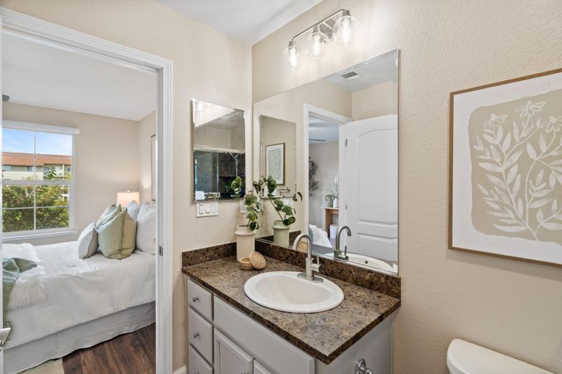 Comprehensively remodeled, this spacious move-in ready townhouse is peacefully nestled beside a scenic park and playground in one of Santa Clara's most desirable communities, just a short drive from the South Bay's largest employers and finest amenities. Smartly updated throughout, the intuitive floor plan ensures comfort and versatility for those craving private office space thanks to three full ensuites, including a ground-floor junior suite and dual upstairs ensuites, showcasing a luxurious master suite with dual sink vanity, separate toilet room, walk-in shower, and french door walk-in closet with built-in storage. The expansive open concept living area with hand-scraped engineered wood flooring is bathed with natural light through panoramic windows and features a spacious updated kitchen with granite countertops & stainless appliances, in-ceiling LED lighting, a utility room with washer and dryer, & a bonus office area. Benefiting from cheap Santa Clara utilities and with too many upgrades to catalog, including newly installed hardwood flooring upstairs, tri-zone central heat and air conditioning, and a fresh professional paint job, this spacious home has been put through an 18-point inspection regimen and is also identified as *Certified Pre-Owned* with a home warranty.